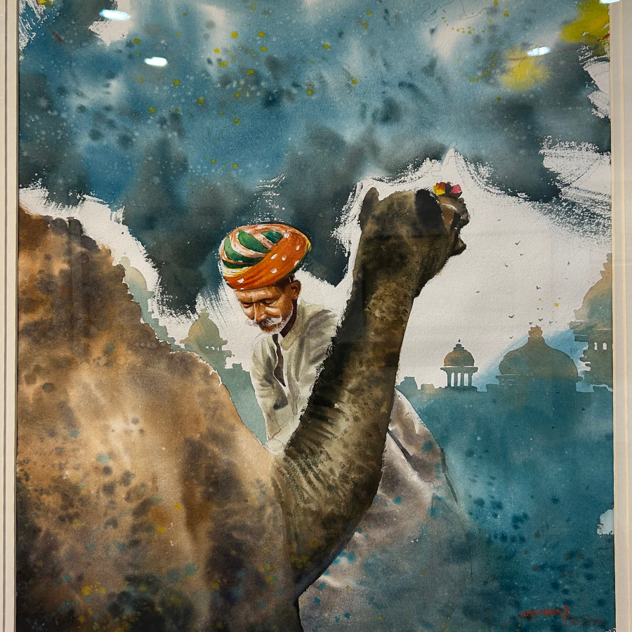 A tender tribute to timeless companionship, अटूट रिश्ता captures the quiet strength and deep connection between man and camel — a relationship woven through tradition, trust, and shared journeys. Painted in delicate watercolours, the scene unfolds against a dreamy backdrop of Rajasthani architecture, where warm earthy tones meet cool, ethereal blues.